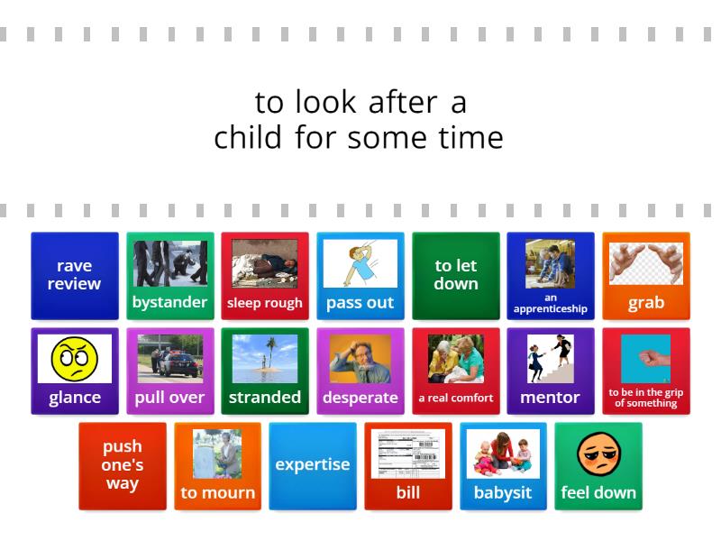 babysit - to look after a child for some time, a real comfort - someone or something that helps you feel better, to mourn - to be sad because someone you know died , to let down - fail to help somebody in a difficult situation, desperate - having very little hope , an apprenticeship - working in order to learn a particular skill, feel down - to be upset , bill - the piece of paper where it is stated how much money you have to pay for smth, mentor - an experienced person who helps and guides someone lnew at work, expertise - knowledge or skill in a particular subject, activity or job, sleep rough - to sleep outside or in the street , grab - to take something quickly, suddenly or with much force, stranded - staying in a place with no opportunity to leave or move, pull over - to stop at the side of the road, rave review - good things that a person says about a place, a film, service etc, bystander - a person who sees something that is happening but is not involved, push one's way - try to move forward through the crowd, glance - to look quickly, pass out - lose one's consciousness , to be in the grip of something - to be seriously affected by smth,