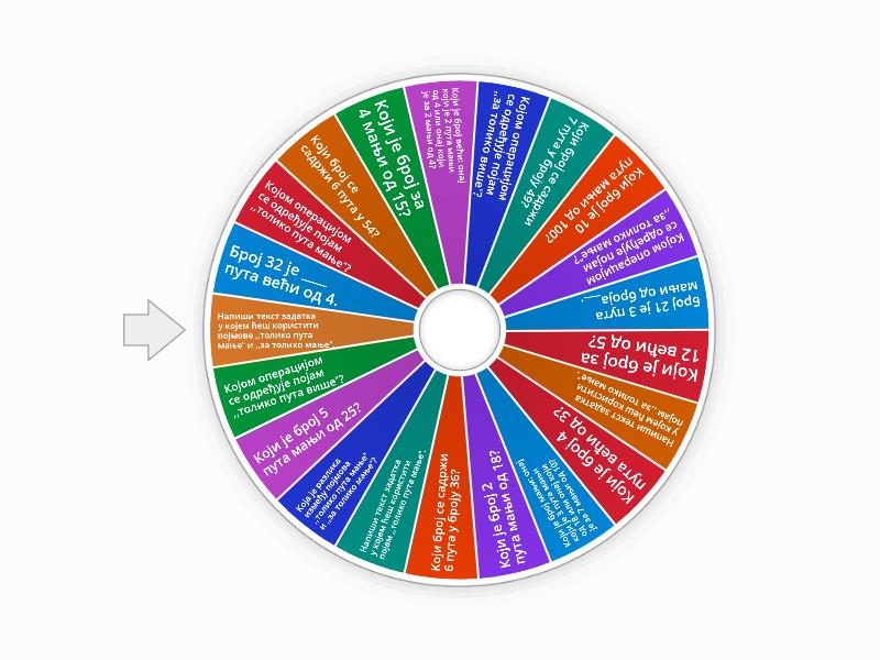 1) Број 32 је ____ пута већи од 4. 2) Којом операцијом се одређује појам ,,толико пута мање“? 3) Који број се садржи 6 пута у 54? 4) Који је број за 4 мањи од 15? 5) Који је број већи: онај који је 2 пута мањи од 4 или онај који је за 2 мањи од 4? 6) Којом операцијом се одређује појам ,,за толико више“? 7) Који број се садржи 7 пута у броју 49? 8) Који број је 10 пута мањи од 100? 9) Којом операцијом се одређује појам ,,за толико мање“? 10) Број 21 је 3 пута мањи од броја___. 11) Који је број за 12 већи од 5? 12) Напиши текст задатка у којем ћеш користити појам ,,за толико мање“. 13) Који је број 4 пута већи од 3? 14) Који је број мањи: онај који је 3 пута мањи од 18 или онај који је за 7 мањи од 10? 15) Који је број 2 пута мањи од 18? 16) Који број се садржи 6 пута у броју 36? 17) Напиши текст задатка у којем ћеш користити појам ,,толико пута мање“. 18) Која је разлика између појмова ,,толико пута мање“ и ,,за толико мање“? 19) Који је број 5 пута мањи од 25? 20) Којом операцијом се одређује појам ,,толико пута више“? 21) Напиши текст задатка у којем ћеш користити појмове ,,толико пута мање“ и ,,за толико мање“.