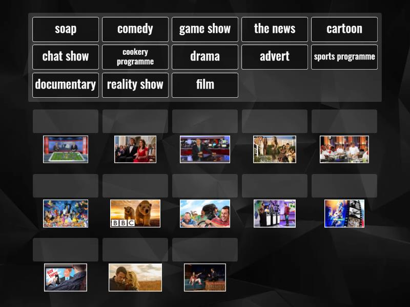 chat show, sports programme, comedy, cookery programme, drama, documentary, film, game show, soap, cartoon, reality show, the news, advert,