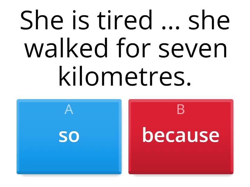 1) She is tired ... she walked for seven kilometres. a) so b) because 2) She drinks water ... she is thirsty. a) so b) because 3) She has a lot of money ... she can buy that expensive dress. a) so b) because 4) The door was open ... I closed it. a) so b) because 5) The water wasn't clean ... we didn't swim. a) so b) because 6) We walked home ... there were no buses. a) so b) because 7) I closed the window ... it was cold. a) so b) because 8) Sweden is a cold country ... people wear warm clothes in winter. a) so b) because 9) I was angry ... my neighbor had a noisy party. a) so b) because