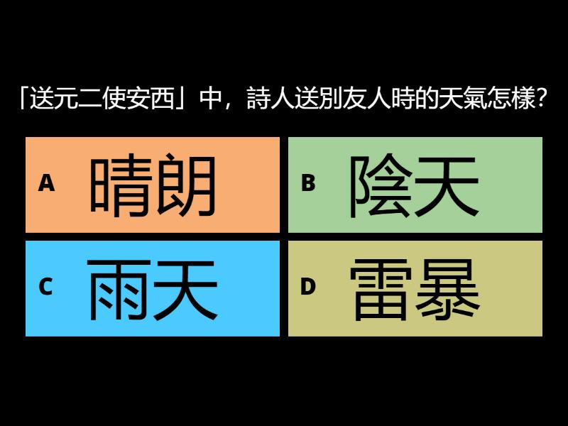1) 「送元二使安西」中,詩人送別友人時的天氣怎樣? a) 晴朗 b) 陰天 c) 雨天 d) 雷暴 2) 「送元二使安西」中,客舍周圍的柳樹是怎樣的? a) 粗壯 b) 幼小 c) 枯黃 d) 翠綠 3) 「送元二使安西」中,詩人請元二做甚麼? a) 帶走一杯酒 b) 喝光一杯酒 c) 放下手上的酒 d) 把杯子倒滿酒 4) 「送元二使安西」中,詩中的「故人」是甚麼意思? a) 新朋友 b) 老朋友 c) 已逝世的人 d) 講故事的人 5) 「楓橋夜泊」中,鸕鶿在甚麼時份啼叫? a) 清晨 b) 下午 c) 黃昏 d) 晚上 6) 「楓橋夜泊」中,漫天滿佈了甚麼 a) 烏鴉 b) 鸕鶿 c) 霜雪 d) 月光 7) 「楓橋夜泊」中,詩人怎樣形容自己 a) 睡得香甜 b) 對着愁雲而睡 c) 滿懷希望而睡 d) 滿懷鄉愁而睡 8) 「楓橋夜泊」中,夜半的鐘聲從哪裏來? a) 客船 b) 江邊 c) 寒山寺 d) 姑蘇城