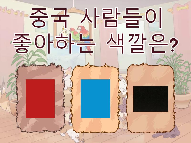 1) 중국 사람들이 좋아하는 색깔은? a) b) c) 2) 중국 사람들이 좋아하는 숫자는? a) b) c) 3) 다음 중 중국에서 쓰는 한자는? a) b) 4) 중국은 얼마나 클까? a) 한국의 96배  b) 한국의 5배 5) 중국은 몇 개의 민족으로 이루어져 있을까? a) 56개 민족 b) 1개 민족 6) 중국의 민족 중 가장 많은 민족은? a) 한족 b) 소수민족 7) 중국을 대표하는 연극은? a) 탈춤 b) 경극 8) 중국을 대표하는 무술은? a) 태권도 b) 태극권 9) 중국의 전통의상은? a) 한복 b) 치파오