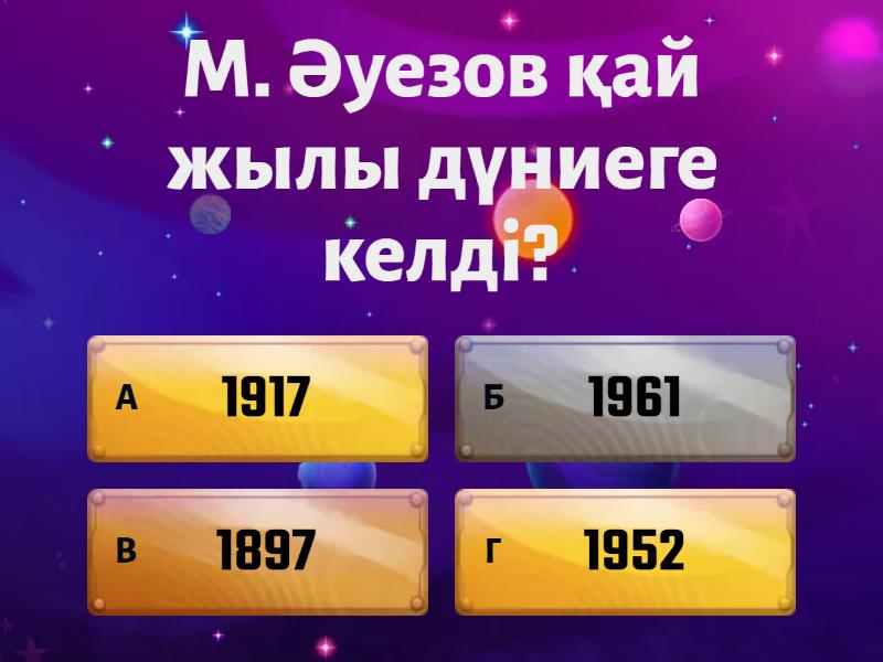 1) М. Әуезов қай жылы дүниеге келді? a) 1917 b) 1961 c) 1897 d) 1952 2) «Көксерек»әңгімесінің авторы кім? a) Мұхтар Әуезов b) Мұхтар Шаханов c) Абай Құнанбаев d) Мағжан Жұмабаев 3) Сұраулық шылауларды тап a) ның, нің, дың, дің b) Ма, ме, ба, бе, па, пе, ша, ше. c) Мыз, біз, быз, біз, пыз, піз d) Ыс, іс, с 4) Аққасқырдың бауырында қанша күшігі болды? a) 5 b) 8 c) 7 d) 4 5) Көксеректі Құрмаш несіне қарап таныды? a) Құлағына b) Бойына c) Тісіне d) Көзіне 6) Көксеректі жеңген иттің аты? a) Ақтөс b) Аққасқа c) Үлкен төбет d) Ақ ит 7) Құрмаш Көксеректі соңғы рет қай жерде кездестірді ? a) Ауылда b) Ойнап жүргенде c) Қой бағып жүргенде d) Құрмаштың үйінде 8) Әңгімеде оқиға орын алған мекен? a) Қараадыр b) Текелі c) Алматы d) Қарабұлақ 9) Көксерек ауылға келгеннен соң неше күннен кейін көзін ашты? a) 4 b) 1 c) 1.5 d) 2 10) Құрмаштың өлімінің себебі? a) Үсіп қалды b) Көксерек шабуыл жасады c) Адасып кетті d) Көксеректен қашамын деп 11) Көксерек әңгімесі қашан жазылды? a) 1929 b) 1917 c) 1927 d) 1961 12) көксерек әңгімесіндегі баланың аты кім? a) Қасен b) Құрмаш c) Қанабек d) Бейсенбай 13) М. Әуезов әңгімесі қайсы? a) көксерек b) Бастау c) Айт күндері d) Қыз Жібек пен Төлеген