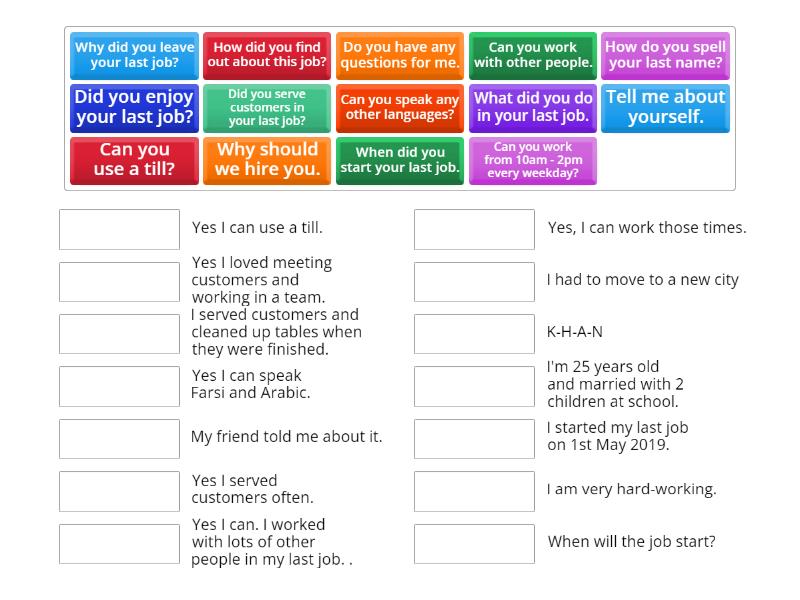 How do you spell your last name? - K-H-A-N, Tell me about yourself. - I'm 25 years old and married with 2 children at school., Can you use a till? - Yes I can use a till., Why did you leave your last job? - I had to move to a new city, Can you work with other people. - Yes I can. I worked with lots of other people in my last job. ., How did you find out about this job? - My friend told me about it., Why should we hire you. - I am very hard-working., Do you have any questions for me. - When will the job start?, Did you serve customers in your last job? - Yes I served customers often. , When did you start your last job. - I started my last job on 1st May 2019. , What did you do in your last job. - I served customers and cleaned up tables when they were finished. , Can you speak any other languages? - Yes I can speak Farsi and Arabic. , Did you enjoy your last job? - Yes I loved meeting customers and working in a team. , Can you work from 10am - 2pm every weekday? - Yes, I can work those times. ,