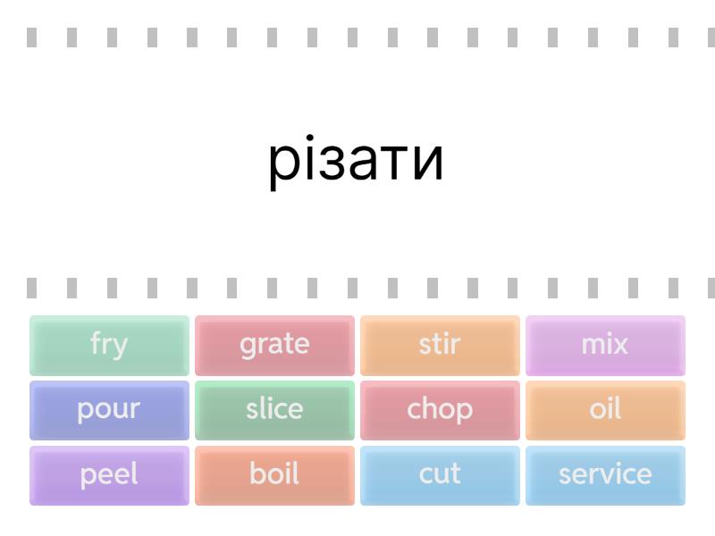cut - різати, chop - нарізати шматочками, oil - мастити, slice - нарізати слайсами, скибками, mix - перемішувати, pour - наливати, fry - смажити, boil - варити, peel - чистити, service - подавати, серверувати, grate - натерти на тертушці, stir - мішати,