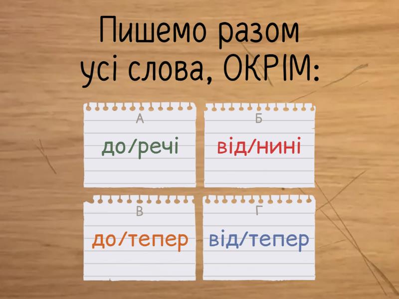1) Пишемо разом усі слова, ОКРІМ:  a) до/речі b) від/нині c) до/тепер d) від/тепер 2) Пишемо РАЗОМ слово: a) на/добраніч b) до/побачення c) до/завтра d) до/тла 3) Пишемо ОКРЕМО слова a) що/разу b) що/вівторка c) що/сили d) хіба/що 4) Пишемо без дефіса слово a) по/вовчи b) по/батькові c) по/латині d) по/українськи 5) ОКРЕМО пишемо слово a) о/полудні b) о/півночі c) уві/сні d) на/яву 6) Пишемо РАЗОМ a) по/одинці b) по/одному 7) Пишемо окремо a) без/вісті b) без/перестанку c) без/упину 8) Пишемо з дефісом усі слова, ОКРІМ a) хтозна/де b) поза/очі c) будь/коли d) як/небудь 9) ОКРЕМО напишемо a) по/двоє b) на/впіл c) на/двоє 10) РАЗОМ напишемо a) в/цілому b) в/основному c) по/суті d) в/нічию