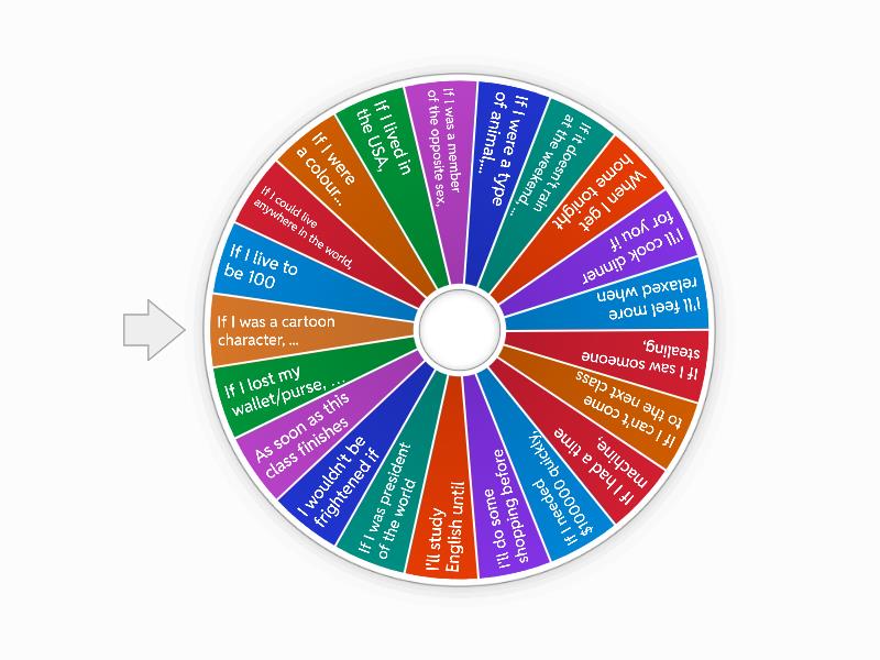 If I lost my wallet/purse, …, If I were a colour..., I'll feel more relaxed when, If I was president of the world, When I get home tonight, If I can't come to the next class, If I were a type of animal,..., If it doesn't rain at the weekend, ..., I wouldn't be frightened if, I’ll do some shopping before, If I was a cartoon character, ..., If I could live anywhere in the world,, If I saw someone stealing,, If I was a member of the opposite sex,, I'll cook dinner for you if, If I needed $100000 quickly,, As soon as this class finishes, If I had a time machine,, If I lived in the USA,, I'll study English until, If I live to be 100.