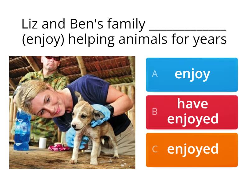 1) Liz and Ben's family _____________ (enjoy) helping animals for years a) enjoy b) have enjoyed c) enjoyed 2) Lisa, dinner is ready! I ___________________ for more than 5 minutes! a) have been calling b) called c) was calling 3) I had a terrible first semester, but things _____________ (get better) now a) get b) have been getting c) are getting 4) Liz ______________ (not wear) her favourite outfits at home a) doesn't wear b) isn't wearing c) hasn't worn 5) I ________________ (never/done/ a bungee jump before! a) never do b) never did c) have never done 6) We ____________ (not have) classes on Friday for teacher's day a) didn't have b) haven't had c) don't have 7) Giraffes _____________ (eat) the leaves off tall trees a) eats b) eat c) are eating 8) I ________________ (be) in London three times. I love it! a) was b) were c) have been 9) Mary has been interested in animals ____________ more than 10 years a) since b) for c) yet 10) I haven't done my homework ____________ a) still b) now c) yet