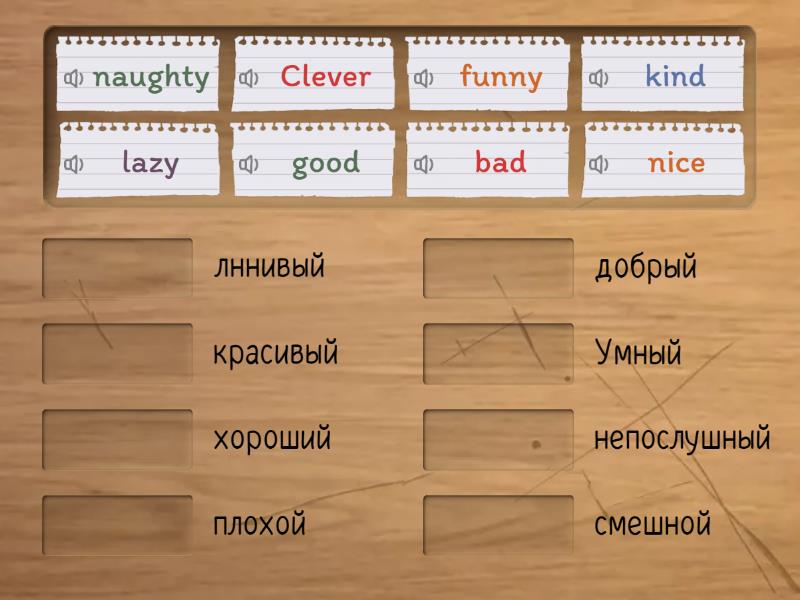 Clever - Умный, good - хороший, bad - плохой, nice - красивый, naughty - непослушный, kind - добрый, funny - смешной, lazy - лннивый,