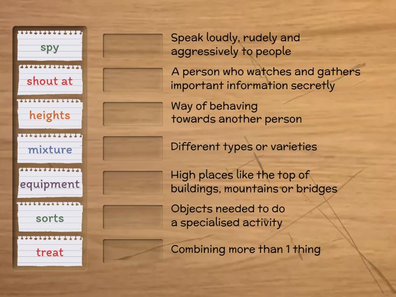 mixture - Combining more than 1 thing, sorts - Different types or varieties, equipment - Objects needed to do a specialised activity, shout at - Speak loudly, rudely and aggressively to people, treat  - Way of behaving towards another person, spy - A person who watches and gathers important information secretly, heights - High places like the top of buildings, mountains or bridges,