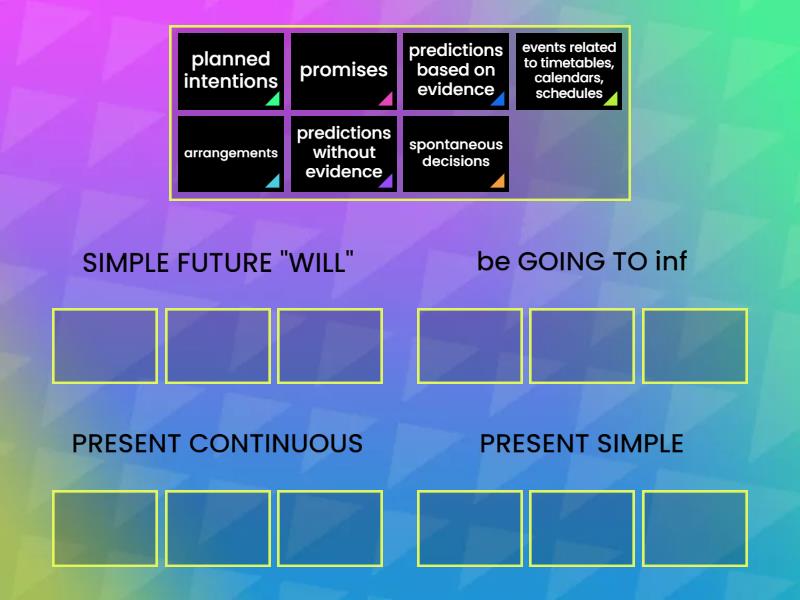 SIMPLE FUTURE "WILL" : predictions without evidence, spontaneous decisions, promises, be GOING TO inf : planned intentions, predictions based on evidence , PRESENT CONTINUOUS: arrangements, PRESENT SIMPLE : events related to timetables, calendars, schedules,