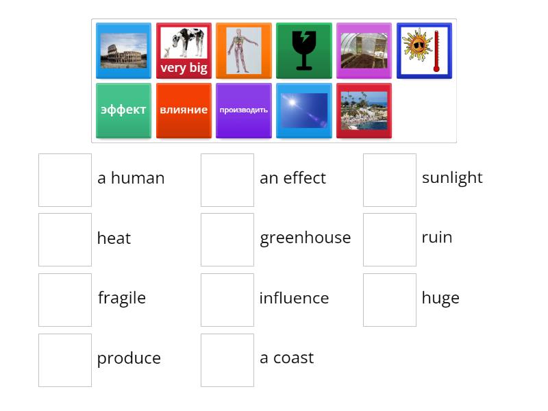 greenhouse, ruin, very big - huge, влияние - influence, fragile, sunlight, a coast, a human, heat, производить - produce, эффект - an effect,