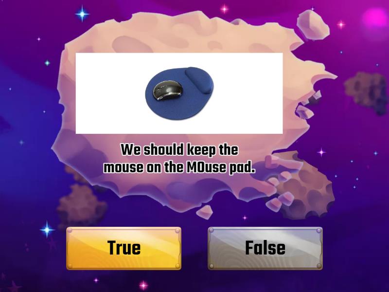 True: We should keep the mouse on the MOuse pad. , The mouse is a pointing device., We can make a drawing with a mouse., The scroll wheel is placed between the left and right button, A ball mouse has a ball under it, An optical mouse uses light instead of a ball., False: A mouse pointer is connected to the C.P.U., The left button is clicked with the middle finger., We can not play games with a mouse., A Wireless mouse can not be attached to a computer, The wire of a mouse is connected to the monitor, We should click the buttons of a mouse hard.,