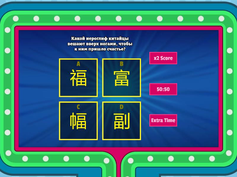 1) Китайский Новый год по-китайски называется 春节 Чунь Цзе? Что это означает? a) Праздник зимы b) Праздник весны c) Праздник драконьих лодок d) Праздник фонарей 2) Сколько дней длится праздник? a) 10 дней b) 5 дней c) 14 дней d) 7 дней 3) Какой цвет преобладает в оформлении Китайского Нового года ? a) красный b) жёлтый c) белый d) оранжевый 4) Когда отмечают Китайский Новый год? a) 20 января b) 9 февраля c) каждый год по-разному d) 17 февраля 5) Главный подарок, который дарят детям во время Китайского Нового года? a) фонарик b) статуэтка c) красный конверт d) украшения 6) Когда наступает Китайский Новый год в 2025 году? a) 6 февраля b) 22 января c) 10 февраля d) 29 января 7) Сколько всего животных в китайском гороскопе? a) 9 b) 6 c) 10 d) 12 8) Что из этого является символами Китайского Нового года? a) Красные полоски с пожеланиями на дверь b) Китайский традиционный костюм ханьфу c) Пирожки цзунцзы d) Лунные пирожные с разными начинками 9) Сколько лет отмечается Китайский Новый год? a) более 1000 лет b) более 500 лет c) более 4000 лет d) более 2500 лет 10) Какое животное по китайскому календарю символ 2025 года? a) тигр b) змея c) дракон d) кролик 11) Какое самое распространенное блюдо на китайском новогоднем столе? a) пельмени b) лапша c) лунные пряники d) рис 12) Почему запускают фейерверки во время праздника?  a) красиво b) для атмосферы c) отпугнуть злых духов d) везде так делают 13) Какой иероглиф китайцы вешают вверх ногами, чтобы к ним пришло счастье? a) 福 b) 富 c) 幅 d) 副