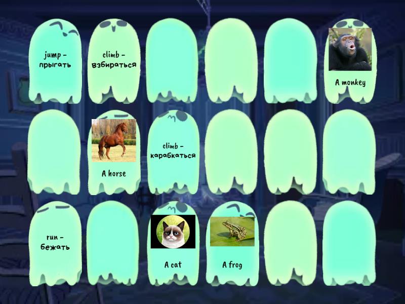 A monkey - climb - взбираться, A cat - climb - карабкаться, A horse - run - бежать, A frog - jump - прыгать, A fish - swim - плавать, A boy - swing - качаться, A girl - sing - петь,   - dance - танцевать, A bird - fly - лететь,