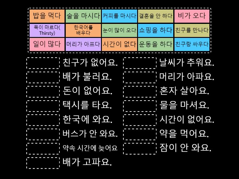 목이 마르다( Thirsty) - 물을 마셔요., 운동을 하다 - 배가 고파요., 일이 많다  - 시간이 없어요., 결혼을 안 하다 - 혼자 살아요., 술을 마시다 - 머리가 아파요., 시간이 없다 - 택시를 타요., 눈이 많이 오다  - 버스가 안 와요., 밥을 먹다 - 배가 불러요., 한국어를 배우다 - 한국에 와요., 머리가 아프다 - 약을 먹어요., 비가 오다 - 날씨가 추워요., 커피를 마시다 - 잠이 안 와요., 친구를 만나다 - 약속 시간에 늦어요 , 쇼핑을 하다 - 돈이 없어요., 친구랑 싸우다 - 친구가 없어요.,