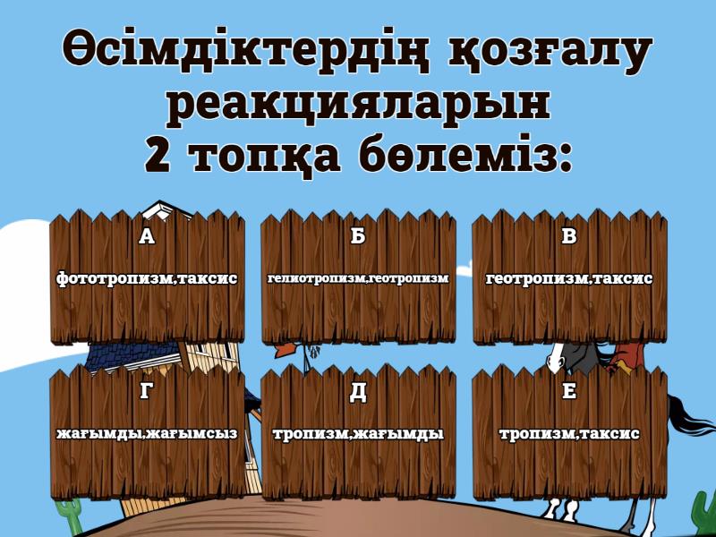 1) Өсімдіктердің қозғалу реакцияларын 2 топқа бөлеміз: a) фототропизм,таксис b) гелиотропизм,геотропизм c) геотропизм,таксис d) жағымды,жағымсыз e) тропизм,жағымды f) тропизм,таксис 2) Өсімдік жасушалары,ұлпалары,мүшелерінің белгілі бір тітіркендіргішке қатысты қозғалу реакциясы: a) тропизм b) таксис c) фототропизм d) гелиотропизм e) геотропизм f) жағымсыз 3) Таксис дегеніміз не? a) қозғалуға қабілетсіз ағзалар b) қозғалуы төмен ағзалар c) берік орналасқан ағзалар d) қозғалмайтын ағзалар e) қозғалуға қабілетті ағзалар f) қозғалусыз тіршілік ететіндер 4) Тропизм 2-ге бөлінеді: a) ретті,ретсіз b) жағымды,жағымсыз c) жағымды,біртекті d) қозғалу,қозғалмау e) қозғалуы төмен,қозғалуы жоғары f) жоғары,төмен 5) Жапырақтар мен өркендердің Күн жарығы бағытында өсуі: a) жағымды таксис b) жағымсыз таксис c) жағымсыз фототропизм d) жағымды фототропизм e) жағымды гелиотропизм f) жағымды геотропизм 6) Жапырақтар мен өркендердің жоғары қарай өсуі: a) жағымды гелиотропизм b) жағымды геотропизм c) жағымсыз фототропизм d) жағымды фототропизм e) таксис f) жағымсыз тропизм 7) Тамырдың жердің ауырлық күшіне байланысты төменге қарай топырақта өсуі: a) жағымды гелиотропизм b) жағымды геотропизм c) жағымсыз фототропизм d) жағымды фототропизм e) таксис f) жағымсыз тропизм 8) Жарықсүйгіш өсімдік: a) Баньян ағашы b) Інжугүл c) Қарағай d) Намазшамгүл e) Қызғалдақ f) Кактус 9) Амебаның қозғалу мүшелері: a) жалғанаяқтары b) кірпікшелер c) талшықтар d) желбезектер e) жүзбеқанаттар f) аяқтар 10) Реактивті қозғалады: a) омыртқасыздар b) амеба,кәдімгі амеба c) кірпікшелі кебісше d) омыртқалылар e) балықтар f) сегізаяқ,медуза 11) Жүйке жасушалары бүкіл денеге ретсіз орналасқандықтан ............ және торлы деп атайды. a) түйінді b) диффузиялық c) түтікшетәрізді d) сатылы e) түтікше түйінді f) күрделі түйінді 12) Буылтық құрттар типі өкілдерінде(шұбалшаң) ең алғаш пайда болған ЖЖ: a) түтікшетәрізді b) ми c) жұлын d) сатылы e) диффузиялық f) түйінді 13) Жұтқыншақүсті және жұтқыншақасты жүйке түйіндері мен құрсақ жүйке тізбектерінен тұратын ЖЖ: a) түтікшетәрізді b) ми c) жұлын d) сатылы e) диффузиялық f) түйінді 14) Түйінді ЖЖ нелерге тән? a) ұлулар,буынаяқтылар типіне b) шұбалшаңға c) буылтық құрттар типіне d) былқылдақденелілерге e) омыртқалыларға f) жалпақ құрттарға 15) Қандай ЖЖ барлық желілі(хордалы) жануарларға тән? a) диффузиялық b) түйінді c) түтікшетәрізді d) торлы e) сатылы f) жұлын 16) Түтікшетәрізді ЖЖ барлық ..................... жануарларға тән: a) қосмекенді b) қылды c) омыртқасыз d) суда мекендейтін e) құрлықта мекендейтін f) омыртқалы 17) Барлық омыртқалылардың миы 5 бөлімнен тұрады: a) алдыңғы,ортаңғы,ми түбірі,сопақша ми,мишық b) алдыңғы,ортаңғы,шүйде,сопақша ми,мишық c) алдыңғы,ортаңғы,маңдай,төбе,мишық d) алдыңғы,ортаңғы,аралық,ми көпірі,гипофиз e) алдыңғы,ортаңғы,аралық,сопақша ми,мишық f) алдыңғы,артқы,аралық,сопақша ми,мишық 18) Нейрондар - ....................................... a) жасушалардың негізгі ұлпасы b) жүйке ұлпасының негізгі жасушалары c) жүйке жасушасының ядросы d) жүйке ұлпасының екінші реттік құрылымы e) жүйке ұлпасының реттелуі f) мидағы жасушалардың үлкеюі 19) Жүйке ұлпаларының негізгі 2 қызметі бар: a) қозғыштық,өткізгіштік b) тасымалдау,реттеу c) тежеу,ұлғайту d) бастапқы,соңғы e) реттелу,бөлу f) ми мен жұлын 20) Ядросы,цитоплазмасы мен барлық негізгі органоидтері бар жасушаларының орталық бөлігі: a) Аксон b) Нейрон c) Ақ зат d) Нейрон денесі e) Нейроглия f) Дендрит 21) Нейронн