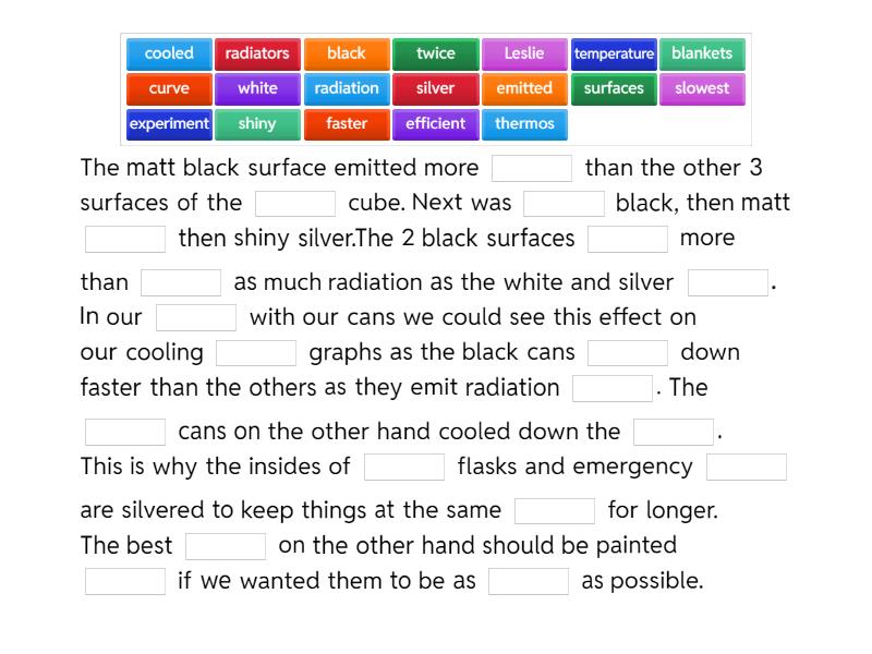 The matt black surface emitted more ____ than the other 3 surfaces of the ____ cube. Next was ____ black, then matt ____ then shiny silver.The 2 black surfaces ____ more than ____ as much radiation as the white and silver ____. In our ____ with our cans we could see this effect on our cooling ____ graphs as the black cans ____ down faster than the others as they emit radiation ____. The ____ cans on the other hand cooled down the ____. This is why the insides of ____ flasks and emergency ____ are silvered to keep things at the same ____ for longer. The best ____ on the other hand should be painted ____ if we wanted them to be as ____ as possible.