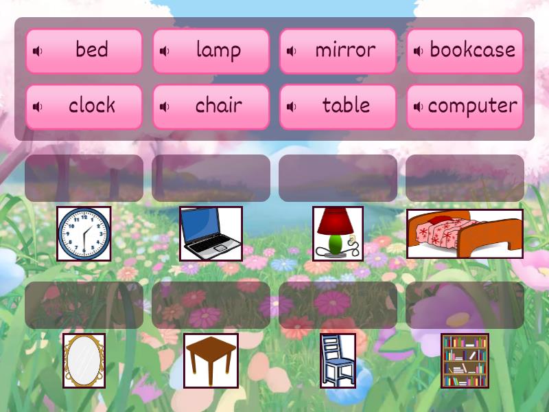 clock, computer, lamp, bed, mirror, table, chair, bookcase,