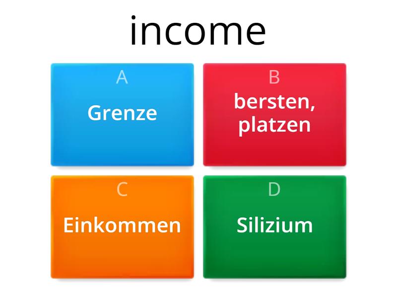 1) income a) Grenze b) bersten, platzen c) Einkommen d) Silizium 2) leading a) Silizium b) Bestandteil; Komponente c) landwirtschaftlich d) führend 3) (to) last a) (an)dauern; anhalten b) Vermögen; Reichtum c) wertvoll; kostbar d) Traube 4) explorer a) bewachen b) Forscher/-in; Entdecker/-in c) Gerät; Vorrichtung d) Jahrzehnt 5) shortage a) Knappheit; Mangel b) sollen; gelten als c) Jahrzehnt d) Einkommen 6) fortune a) sonnig b) Gerät; Vorrichtung c) lateinamerikanisch d) Vermögen; Reichtum 7) cultivation a) sonnig b) landwirtschaftlich c) Anbau d) sollen; gelten als 8) (to) exist a) wertvoll; kostbar b) ansässig sein c) existieren; bestehen d) (an)dauern; anhalten 9) sunny a) nördlich; Nord- b) lateinamerikanisch c) sonnig d) existieren; bestehen 10) device a) Gerät; Vorrichtung b) bersten, platzen c) landwirtschaftlich d) jdm. zu etwas drängen 11) (to) be based a) ansässig sein b) sollen; gelten als c) Jahrzehnt d) Dürre; Trockenheit 12) minimum wage a) bleiben b) Mindestlohn c) sonnig d) Anbau 13) entrepreneur a) Dürre; Trockenheit b) Jahrzehnt c) bersten, platzen d) Unternehmer/-in 14) component a) Silizium b) Dürre; Trockenheit c) Vermögen; Reichtum d) Bestandteil; Komponente 15) Latino a) Erdbeere b) Forscher/-in; Entdecker/-in c) lateinamerikanisch d) (an)dauern; anhalten 16) silicon a) wertvoll; kostbar b) Silizium c) Traube d) führend 17) strawberry a) Erdbeere b) Gerät; Vorrichtung c) Unternehmer/-in d) sonnig 18) decade a) Jahrzehnt b) jdm. zu etwas drängen c) nördlich; Nord- d) Mindestlohn 19) (to) close down a) jdm. zu etwas drängen b) den Betrieb einstellen; schließen c) Erdbeere d) Vermögen; Reichtum 20) agricultural a) nördlich; Nord- b) den Betrieb einstellen; schließen c) Anbau d) landwirtschaftlich 21) precious a) sollen; gelten als b) Bestandteil; Komponente c) wertvoll; kostbar d) bleiben 22) (to) burst, burst, burst a) den Betrieb einstellen; schließen b) Vermögen; Reichtum c) sonnig d) bersten, platzen 23) (to) urge sb to do sth a) jdm. zu etwas drängen b) Gerät; Vorrichtung c) Vermögen; Reichtum d) Mindestlohn 24) (to) guard a) jdm. zu etwas drängen b) nördlich; Nord- c) bewachen d) Silizium 25) (to) be said to (+inf) a) bewachen b) sollen; gelten als c) Gerät; Vorrichtung d) Vermögen; Reichtum 26) grape a) führend b) jdm. zu etwas drängen c) Traube d) Bestandteil; Komponente 27) border a) landwirtschaftlich b) Grenze c) Traube d) bewachen 28) drought a) ansässig sein b) führend c) Dürre; Trockenheit d) Erdbeere 29) (to) remain a) lateinamerikanisch b) Einkommen c) bleiben d) Unternehmer/-in 30) northern a) bleiben b) nördlich; Nord- c) Traube d) sonnig