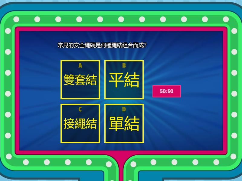 1) 常見的安全繩網是何種繩結組合而成? a) 雙套結 b) 接繩結 c) 平結 d) 單結 2) 在搭建帳篷時,如果遇到調節片遺失或損壞,可以使用哪一個繩結來替代調節片的功能? a) 平結 b) 接繩結 c) 雙套結 d) 營繩結 3) 在戶外活動時若不幸發生意外傷害需要進行急救包紮時,最需要用到的繩結是什麼? a) 平結 b) 單結 c) 雙套結 d) 營繩結