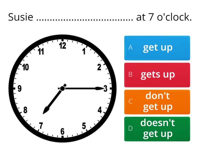 1) Susie .................................... at 7 o'clock. a) get up b) gets up c) don't get up d) doesn't get up 2) We .................................... in the school canteen at 12:30. a) have lunch b) has lunch c) don't have lunch d) doesn't have lunch 3) My football lesson .................................... at 4 pm. a) start b) starts c) don't start d) doesn't start 4) The baby .................................... at 5 am every day! a) wake up b) wakes up c) don't wake up d) doesn't wake up 5) My grandparents .................................... shopping at 10 am every Tuesday. a) go b) goes c) don't go d) doesn't go 6) The fourth lesson .................................... at twenty to twelve. a) end b) ends c) don't end d) doesn't ends 7) My parents .................................... to bed at half past ten. a) go b) goes c) don't go d) doesn't go 8) Tom, Peter and their friends .................................... dinner at half past seven every day. a) have b) has c) don't have d) doesn't have 9) My dog Chewy .................................... walking along the river at 6 am. a) love b) loves c) don't have d) doesn't have 10) On Sunday, my kids .................................... at 8 am. a) wake up b) wakes up c) don't wake up d) doesn't wake up