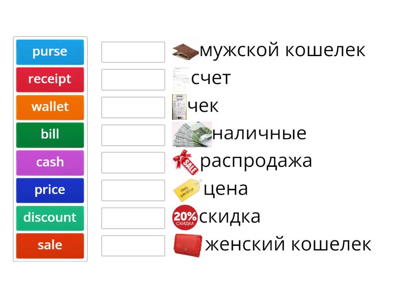 bill - счет, cash - наличные, discount - скидка , price - цена, purse - женский кошелек, receipt - чек, sale - распродажа , wallet - мужской кошелек,