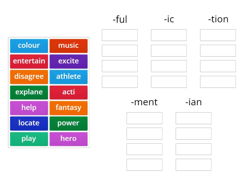 -ful: play, colour, help, power, -ic: athlete, hero, fantasy, -tion: acti, explane, locate, -ment: disagree, entertain, excite, -ian: music,