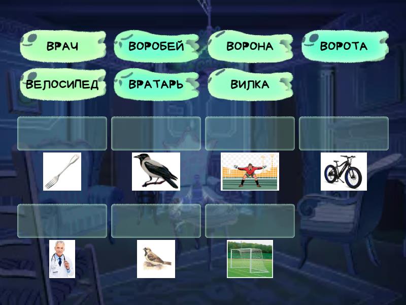ВОРОТА, ВЕЛОСИПЕД, ВИЛКА, ВРАТАРЬ, ВОРОБЕЙ, ВОРОНА, ВРАЧ,