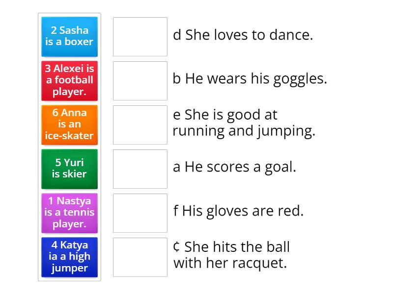 1 Nastya is a tennis player. - ¢ She hits the ball with her racquet., 2 Sasha is a boxer - f His gloves are red., 3 Alexei is a football player. - a He scores a goal., 4 Katya ia a high jumper - e She is good at running and jumping., 5 Yuri is skier - b He wears his goggles., 6 Anna is an ice-skater - d She loves to dance.,