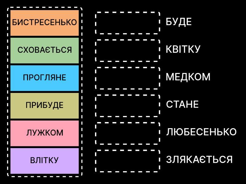СХОВАЄТЬСЯ - ЗЛЯКАЄТЬСЯ, ПРОГЛЯНЕ - СТАНЕ, БИСТРЕСЕНЬКО - ЛЮБЕСЕНЬКО, ПРИБУДЕ - БУДЕ, ВЛІТКУ - КВІТКУ, ЛУЖКОМ - МЕДКОМ,