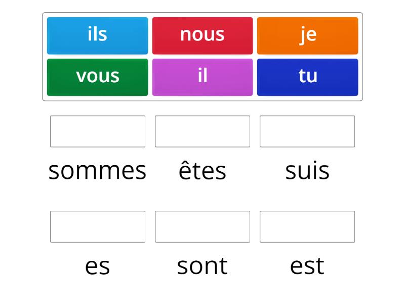 je - suis, tu - es, il - est, nous - sommes, vous - êtes, ils - sont,