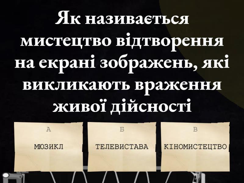 1) Як називається мистецтво відтворення на екрані зображень, які викликають враження живої дійсності a) МЮЗИКЛ b) ТЕЛЕВИСТАВА c) КІНОМИСТЕЦТВО 2) У якій країні народилося кіно? a) В Італії b) У Франції c) У Німеччині 3) Що це за пристрій? a) КІНЕТОСКОП b) КІНОКАМЕРА c) ФОТОАПАРАТ 4) Які види мистетцва поєдналися у кінематографі? a) АРХІТЕКТУРА b) ЛІТЕРАТУРА c) МУЗИКА d) СКУЛЬПТУРА e) ТЕАТР f) ЖИВОПИС 5) Як називається літературно-драматичний твір, написаний як основа для постановки кіно- або телефільму. a) ЛІБРЕТО b) РОЗПОВІДЬ c) СЦЕНАРІЙ 6) Кого вважають творцями кінематографа? a) ЧАРЛІ ЧАПЛІНА b) БРАТІВ ЛЮМ'ЄРІВ c) С. ЕЙЗЕНШТЕЙНА ТА Ф.В.МУРНАУ