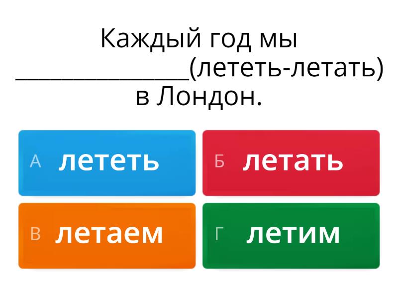 1) Каждый год мы _______________(лететь-летать) в Лондон. a) лететь b) летать c) летаем d) летим 2) Сегодня я __________________(ехать-ездить) в Ниш. a) еду b) ездить c) езжу d) ехать 3) Рыбы ________________(плыть-плавать) в море. a) плывут b) плыть c) плавать d) плавают 4) Ребёнок _______________(бежaть-бегать) к маме. a) бежит b) бежaть c) бегает d) бегать 5) Игорь часто ________________ (идти-ходить) на стадион. a) идёт b) ходит c) ходить d) идти 6) Сегодня мои родители ________________ (идти-ходить) на родительское собрание. a) идти b) ходят c) идут d) ходить 7) Я ________________(ехать-ездить) в спортивный центр три раза в неделю. a) еду b) ехать c) ездить d) езжу 8) Мой папа часто _________________ (лететь-летать) в Дубаи. a) летает b) лететь c) летать d) летит 9) Мы _______________ (бежать-бегать) по двору. a) бежим b) бегаем c) бегать d) бежать 10) Ты часто туда ____________ (ехать – ездить)? a) ездить b) едешь c) ехать d) ездишь 11) Куда ты сейчась ____________ (идти – ходить)? a) идёшь b) ходить c) ходишь d) идти 12) Эти туристы завтра____________ (лететь – летать) в Италию. a) летают b) лететь c) летят d) летать 13) Смотри, как он ____________ (плыть – плавать) к нам! a) плавает b) плыть c) плавать d) плывёт 14) Вы очень хорошо ___________ (плыть - плавать)? a) плывёте b) плыть c) плавать d) плаваете 15) Современные самолёты очень быстро _____________ (лететь - летать). a) летают b) лететь c) летать d) летят