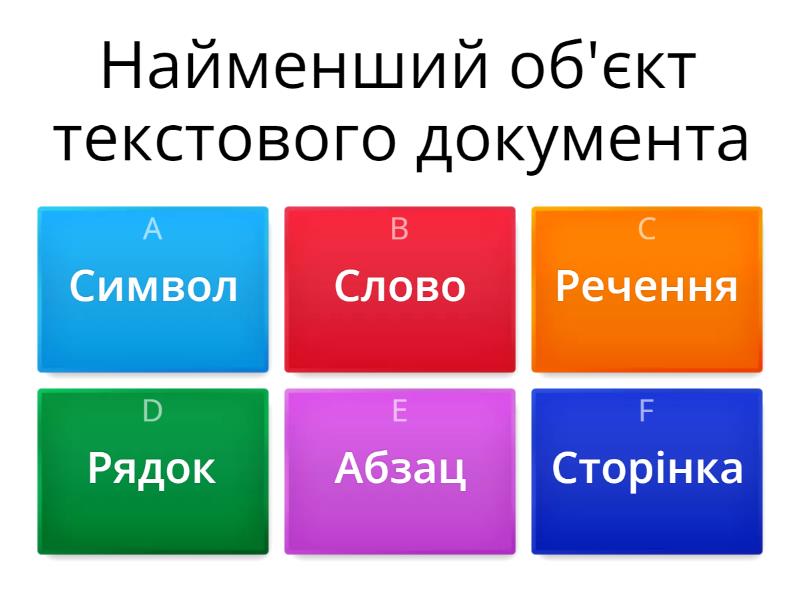 1) Найменший об'єкт текстового документа a) Символ b) Слово c) Речення d) Рядок e) Абзац f) Сторінка 2) Змінення змісту текстового документа a) Редагування b) Форматування c) Збереження d) Коригування e) Коментування f) Виправлення 3) Змінення вигляду текстового документа a) Редагування b) Форматування c) Збереження d) Коригування e) Коментування f) Виправлення 4) За допомогою яких гарячих клавіш можно скопіювати виділений текст? a) Ctrl+C b) Ctrl+V c) Ctrl+X d) Сtrl+P e) Сtrl+S f) Сtrl+Z 5) За допомогою яких гарячих клавіш можно вставити скопійований текст? a) Ctrl+C b) Ctrl+V c) Ctrl+X d) Сtrl+P e) Сtrl+S f) Сtrl+Z 6) За допомогою якої клавіши створюється новий абзац? a) Shift b) Ctrl c) Enter d) CapsLosc e) Alt f) Esc 7) За допомогою якої клавіши створюється велика літера? a) Shift b) Ctrl c) Enter d) CapsLosc e) Alt f) Esc 8) За допомогою якої клавіши створюється багато великих літер? a) Shift b) Ctrl c) Enter d) CapsLosc e) Alt f) Esc