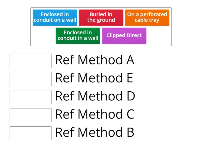 Clipped Direct - Ref Method C, Enclosed in conduit on a wall - Ref Method B, Enclosed in conduit in a wall - Ref Method A, Buried in the ground - Ref Method D, On a perforated cable tray - Ref Method E,