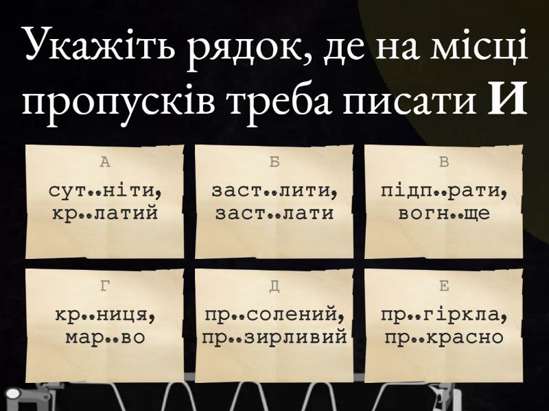 1) Укажіть рядок, де на місці пропусків треба писати И a) сут..ніти, кр..латий b) заст..лити, заст..лати c) підп..рати, вогн..ще d) кр..ниця, мар..во e) пр..солений, пр..зирливий f) пр..гіркла, пр..красно 2) Спрощення приголосних на письмі треба позначити в усіх словах рядка a) проїз..ний, піс..ний, парламен..ський b) ус..ний, улес..ливий, шіс..надцять c) вартіс..ний, швидкіс..ний, щотиж..ня d) хрес..ний, артис..ці, пристрас..ний e) очис..ний, блис..нути, контрас..ний f) хвас..ливий, чес..ний, захис..ник 3) Літеру Е на місці пропуску треба писати в усіх словах рядка a) пр..людія, пр..краса, пр..зирливий b) пр..бічник, пр..славний, пр..леглий c) пр..подобний, пр..бій, пр..ваба d) пр..стиж, пр..парат, пр..м’єрний e) пр..рогатива, пр..стол, пр..горнути f) пр..ховати, пр..звище, пр..гріти 4) Правила вживання лапок дотримані в уривку з афіші a) Творчий колектив «Національної опери України» ім. Т.Г.Шевченка запрошує на прем’єру балету Сергія Прокоф’єва «Ромео і Джульєтта». b) «Кримськотатарський академічний музично-драматичний театр» (м. Сімферополь) пропонує оригінальну постановку Лісової пісні Лесі Українки. c) 20 липня у Львові буде показана моновистава «творчої майстерні Театр у кошику», що є першим сценічним прочитанням поеми Тараса Шевченка «Сон». d) Запрошуємо мешканців і гостей Дніпропетровська на концерти Будинку органної музики. У новому залі з дивовижною акустикою встановлений механічний орган німецької фірми «Зауер», який має 2074 труби. e) Ще в давнину малювали козака «Мамая» на картинах, скринях і стінах. Хто ж він такий? Про це – вистава Донецького обласного театру ляльок «Пригоди козака Мамая». f) Ще в давнину малювали козака Мама» на картинах, скринях і стінах. Хто ж він такий? Про це – вистава Донецького обласного театру ляльок «Пригоди козака Мамая». 5) Літеру И треба писати на місці пропуску в усіх словах рядка: a) вар...во, вул...чка, вовч...ня, схов...ще b) водич...нька, добр..во, страхов...сько, пал...во c) плет...во, порадн...ця, посміхов...сько, доньч...н d) кот...чок, печ...во, виховат...ль, вогн...ще e) русалч...н, кринич...нька, парканч..к, згар...ще f) Ол...н, книж...чка, горл...чко, горл...чка 6) Подвоєння літер у всіх словах іншомовного походження НЕ відбувається в рядку a) нет..о, інтел..ект, шас..і b) нер..аціональний, ір..аціональний, тер..иторіальний c) ем..iграція, ім..іграція, ап..еляція d) барок..о, ком..ісія, тер..ор e) ван..а, кор..ектура, грам.. f) клас.., тер..аса, сю..реалізм 7) Без апострофа треба писати всі слова в рядку a) верб..я, кур..йозний, тьм..яний b) моркв..яний, розз..явити, цв..яшок c) дзв..якнути, ін..єкція, різдв..яний d) дво..ярусний, різьб..яр, Лук..янович e) духм..яний, присв..ята, прим..ятий f) супер...ядро, мавп...ячий, ф...юзеляж 8) Подвоєне нн треба писати на місці пропуску в усіх словах рядка a) бездога..ий, страше..ий, студе..ий b) свяще..ий, довгожда..ий, безіме..ий c) невблага..ий, орли..ий, ешело..ий d) незбагне..ий, моното..ий, безці..ий e) леви..ий, електро..ий, благослове..ий f) обіця...ий, свяще...ик, кін...ий 9) Літеру С на місці пропуску потрібно писати в усіх словах рядка a) ..терти, ..чепитися, ..кинути b) ..творити, ..класти, ..хибити c) ..казати, ..цідити, ..хитрувати d) ..пекти, ..шити, ..формувати e) ...клеїти, ..простити, ..цілити f) ...жувати, не...проста, ...хотіти 10) Усі слова написано правильно в рядку a) викладацький, молотьба, вохкість b) карпатський, дорожчати, робітництво c) криворізький, об’їжджати, французський d) інтелігентський, сонячний, надхнення e) тюркський, свідо