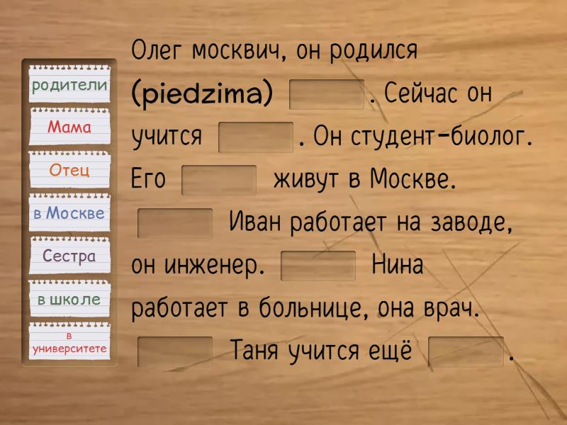 Олег москвич, он родился (piedzima) ____. Сейчас он учится ____. Он студент-биолог. Его ____ живут в Москве. ____ Иван работает на заводе, он инженер. ____ Нина работает в больнице, она врач. ____ Таня учится ещё ____. Нина раньше (agrāk) жила ____. Её родители и сейчас там ____. Олег и Таня часто бывают в Риге, а их ____ и ____ часто пишут письма и бывают в Риге. Они все вместе бывают ____, в цирке, в кино. Дава́йте познако́мимся! Меня́ ____ Мари́я. Моя́ ____ - Ивано́ва. Э́то моя́ ____. Э́то мой ____,его́ зову́т Никола́й. А это моя ____, её зову́т Ната́лья. Мой па́па и моя́ ма́ма – это мои ____. А это мой брат. Его зову́т Андре́й. Э́то его́ жена́. Её зову́т Ка́тя. Э́то их ____: сын Ди́ма и дочь Ната́ша. Ди́ма – мой ____, а Ната́ша – моя́ племя́нница. Я – их ____. А это моя ба́бушка и мой ____. Я – их ____, а Андре́й – их внук. Э́то моя́ тётя Еле́на и её муж Михаи́л. Михаи́л – мой ____, а я – его́ племя́нница. Вот наш дом. Э́то на́ша ____. Его́ зову́т Ша́рик. А где на́ша ко́шка? Вот она́! Му́рка! Меня́ ____ Алекса́ндр. Я по профе́ссии – продаве́ц. Я рабо́таю ____. А это мои ____. Мой оте́ц – инжене́р. Он ____ на заво́де. А моя́ ____ – преподава́тель. Она́ рабо́тает ____. А это моя ____ Елена. Она́ врач и рабо́тает ____. А это мои ____ Анто́н и Са́ша. Они́ не рабо́тают. Они́ ____ в шко́ле.