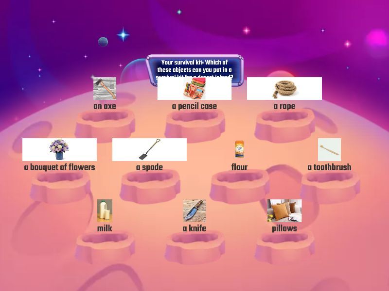 Richtig: an axe, a rope, a spade, a toothbrush, a knife, matches, a pair of scissors, sweets, a bottle, a first aid kit, a book, soap, sunglasses, a pack of seeds, a hammock, Falsch: a pencil case, a bouquet of flowers, flour, milk, pillows, earrings, money, a rolling pin, a tablet, toys, a crossword puzzle, a costume, a coffee machine, a sofa, an ice cream, a soup,