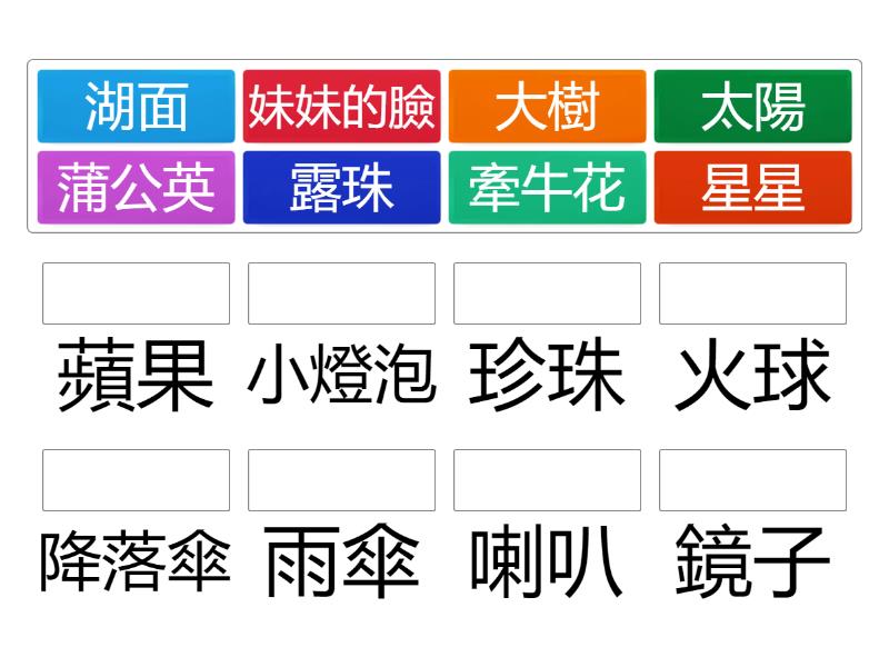 大樹 - 雨傘, 露珠 - 珍珠, 湖面 - 鏡子, 牽牛花 - 喇叭, 星星 - 小燈泡, 太陽 - 火球, 蒲公英 - 降落傘, 妹妹的臉 - 蘋果,