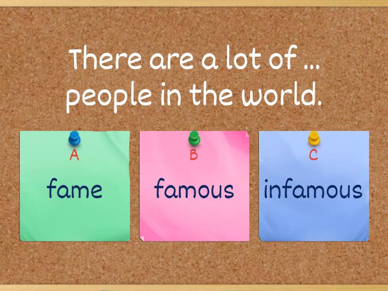 1) There are a lot of ... people in the world. a) fame b) famous c) infamous 2) ... people can make any country famous. a) talented b) talent c) talentous 3) Any person can be .... a) unknown b) well-known c) known