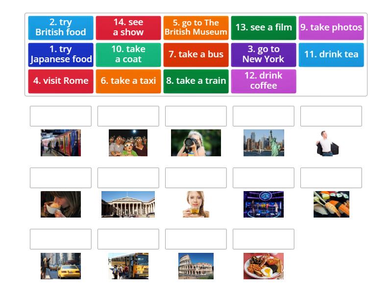 1. try Japanese food, 2. try British food, 3. go to New York, 4. visit Rome, 5. go to The British Museum, 6. take a taxi, 7. take a bus, 8. take a train, 9. take photos, 10. take a coat, 11. drink tea, 12. drink coffee, 13. see a film, 14. see a show,