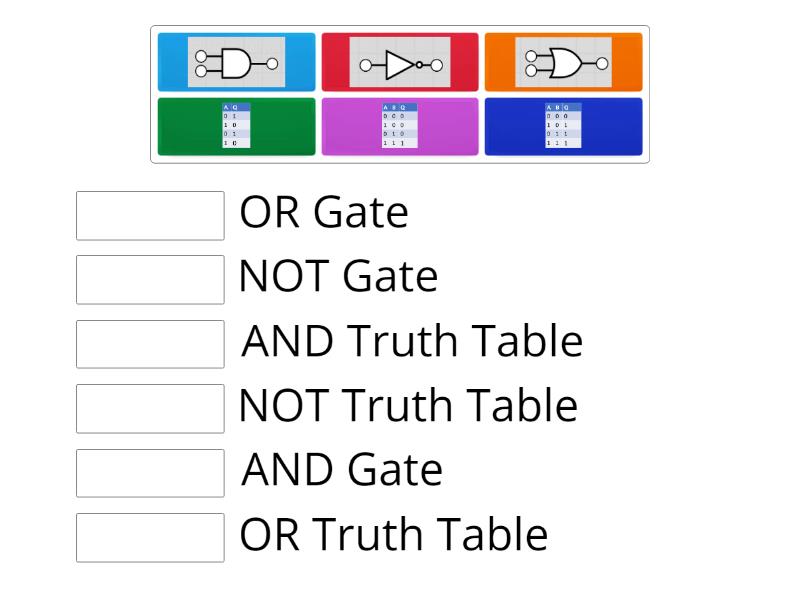 AND Truth Table, AND Gate, NOT Truth Table, NOT Gate, OR Truth Table, OR Gate,