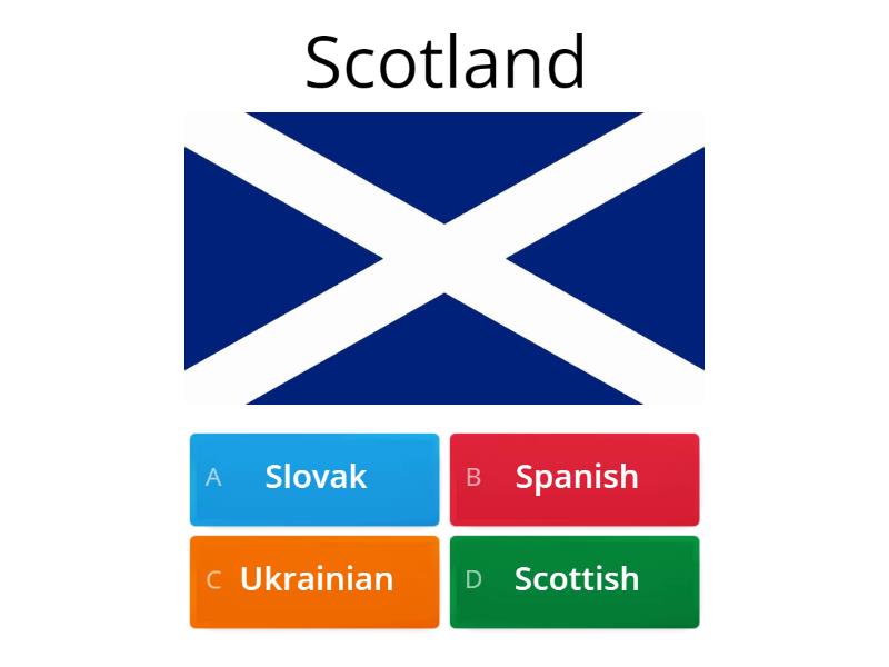 1) Scotland a) Slovak b) Spanish c) Ukrainian d) Scottish 2) Slovakia a) Russian b) Slovak c) Turkish d) Ukrainian 3) Spain a) Scottish b) Swiss c) Spanish d) Slovak 4) Switzerland a) Scottish b) Slovak c) Swiss d) Ukrainian 5) Turkey a) Scottish b) Spanish c) Slovak d) Turkish 6) Russia a) Russian b) Scottish c) Ukrainian d) Slovak 7) Ukraine a) Spanish b) Turkish c) Ukrainian d) Slovak