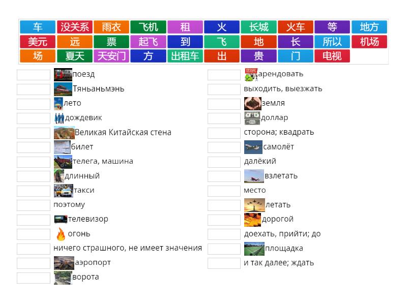 电视 - телевизор, 夏天 - лето, 火车 - поезд, 火 - огонь, 车 - телега, машина, 远 - далёкий, 所以 - поэтому, 飞机 - самолёт, 飞 - летать, 到 - доехать, прийти; до, 票 - билет, 贵 - дорогой, 美元 - доллар, 雨衣 - дождевик, 出租车 - такси, 出 - выходить, выезжать, 租 - арендовать, 机场 - аэропорт, 场 - площадка, 起飞 - взлетать, 地方 - место, 地 - земля, 方 - сторона; квадрать, 等 - и так далее; ждать, 天安门 - Тяньаньмэнь, 长城 - Великая Китайская стена, 没关系 - ничего страшного, не имеет значения, 长 - длинный, 门 - ворота,