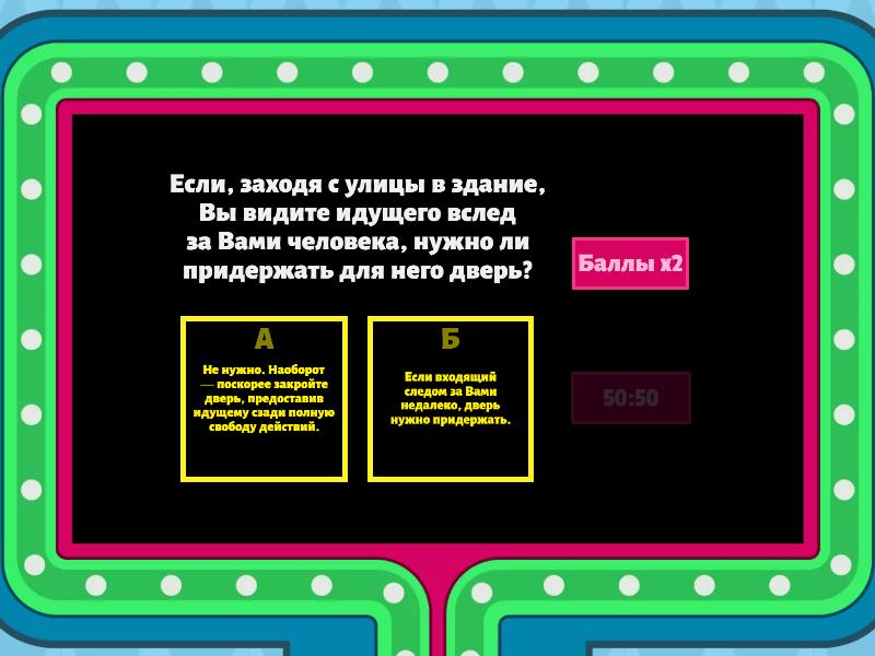 1) В любой семье важны ... a) Добрые отношения, взаимопонимание, помощь b) Грубость c) Равнодушие 2) Правила поведения в школе: a) Разрешено бегать, толкаться, драться b) На уроках можно разговаривать и перебивать учителя c) В школе следует здороваться, носить сменную обувь, вежливо себя вести d) При входе в школу необходимо грубить охраннику 3) Культура поведения - это... a) Наглость и равнодушие b) Вежливые слова и вежливые поступки c) Смех и веселье 4) Другом можно назвать человека, который... a) Игнорирует тебя b) Вместо "ста друзей" выберет "сто рублей" c) Грубит и обзывает тебя d) Поможет в трудную минуту 5) Правила поведения в общественном транспорте: a) Следует расталкивать людей, чтобы скорее зайти в поезд/автобус b) Можно слушать музыку без наушников c) Можно отвлекать водителя/машиниста по пустякам d) Необходимо уступать пожилым людям место в транспорте 6) Если, заходя с улицы в здание, Вы видите идущего вслед за Вами человека, нужно ли придержать для него дверь? a) Не нужно. Наоборот — поскорее закройте дверь, предоставив идущему сзади полную свободу действий. b) Если входящий следом за Вами недалеко, дверь нужно придержать. 7) Вы чихнули, а находящиеся рядом пожелали: «Будьте здоровы!». Как быть? a) Сделать вид, что не расслышали b) Поблагодарить c) Извиниться 8) Кто должен первым выйти из транспорта? a) Женщина b) Пожилой человек c) Мужчина d) Водитель 9) Укажи пословицы о дружбе: a) Не пойман - не вор b) Одной рукой и узла не завяжешь c) Дружба дороже денег 10) Как вести себя в театре? a) Можно опаздывать b) Во время спектакля нельзя разговаривать c) Во время спектакля можно есть