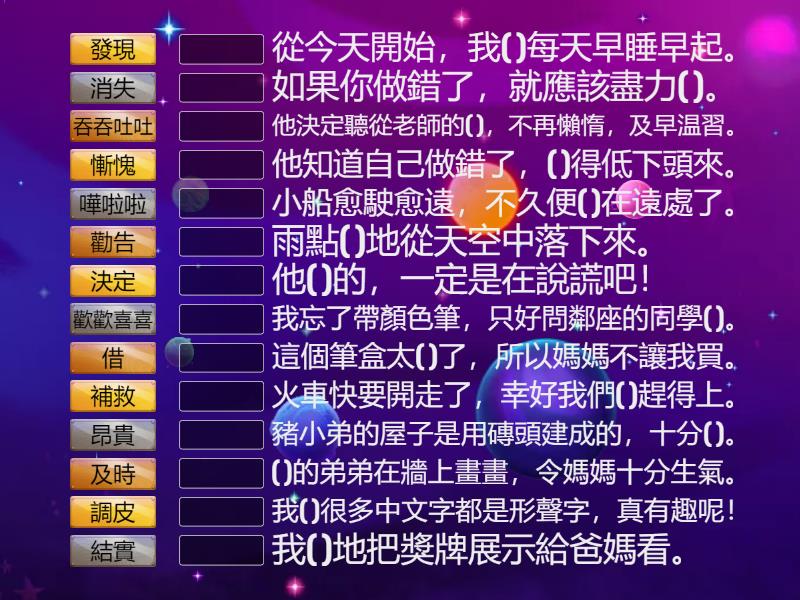 消失 - 小船愈駛愈遠,不久便( )在遠處了。, 調皮 - ( )的弟弟在牆上畫畫,令媽媽十分生氣。, 借 - 我忘了帶顏色筆,只好問鄰座的同學( )。, 嘩啦啦 - 雨點( )地從天空中落下來。, 吞吞吐吐 - 他( )的,一定是在說謊吧!, 歡歡喜喜 - 我( )地把獎牌展示給爸媽看。, 昂貴 - 這個筆盒太( )了,所以媽媽不讓我買。, 慚愧 - 他知道自己做錯了,( )得低下頭來。, 決定 - 從今天開始,我( )每天早睡早起。, 發現 - 我( )很多中文字都是形聲字,真有趣呢!, 勸告 - 他決定聽從老師的( ),不再懶惰,及早温習。, 結實 - 豬小弟的屋子是用磚頭建成的,十分( )。, 及時 - 火車快要開走了,幸好我們( )趕得上。, 補救 - 如果你做錯了,就應該盡力( )。,