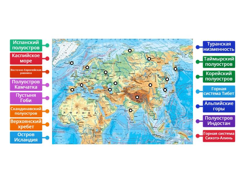 Горная система Тибет, Каспийское море, Скандинавский полуостров, Корейский полуостров, Пустыня Гоби, Альпийские горы, Испанский полуостров, Восточно-Европейская равнина, Полуостров Индостан, Остров Исландия, Горная система Сихотэ-Алинь, Верхоянский хребет, Таймырский полуостров, Полуостров Камчатка, Туранская низменность.