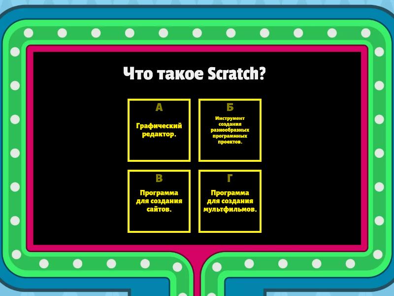 1) Что такое Scratch? a) Графический редактор. b) Инструмент создания разнообразных программных проектов. c) Программа для создания сайтов. d) Программа для создания мультфильмов. 2) Закончи определение: «Алгоритм, выраженный на языке программирования – это…» a) Язык программирования b) Программа c) Блок-схема d) Алгоритм 3) В проекте создано несколько алгоритмов. Выбери из них тот, который управляет движением спрайта: a) b) c) 4) Верно ли утверждение, что все отрицательные числа меньше нуля? a) Да b) Нет c) Иногда да d) Они все равны 0 5) Можно ли вставить изображение, скачанное из сети Интернет, в качестве костюма спрайта? a) Да b) Нет 6) Какой из алгоритмов для спрайта переместит его при нажатии на клавишу «1»? a) b) c) 7) Верно ли утверждение, что все отрицательные числа на числовой прямой лежат правее нуля? a) Верно b) Неверно c) Они все равны 0 d) Иногда верно 8) Как в Scratch называется пространство, по которому двигаются спрайты? a) Сцена b) Область скриптов c) Область спрайтов d) Фоны 9) Какой из алгоритмов для спрайта переместит его при нажатии на клавишу «Пробел»? a) b) c) 10) Верно ли, что в графическом редакторе Scratch нельзя сделать рисунок фона сцены? a) Да b) Нет