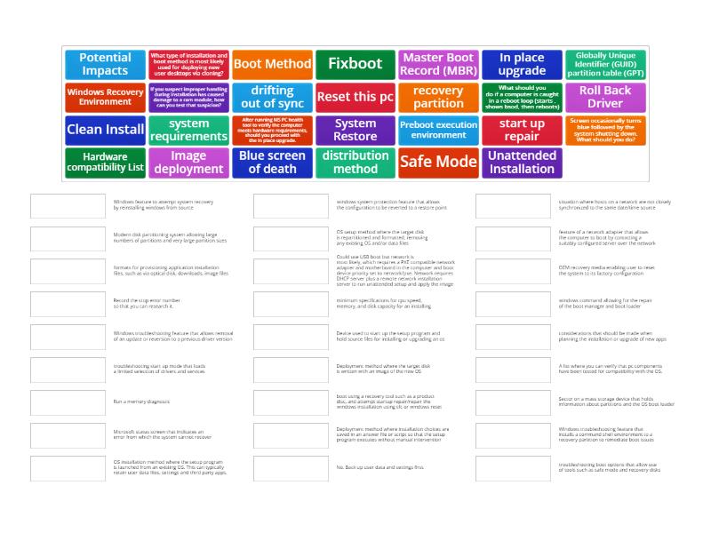 Clean Install - OS setup method where the target disk is repartitioned and formatted, removing any existing OS and/or data files , In place upgrade - OS installation method where the setup program is launched from an existing OS. This can typically retain user data files, settings and third party apps. , Hardware compatibility List - A list where you can verify that pc components have been tested for compatibility with the OS. , Unattended Installation - Deployment method where installation choices are saved in an answer file or script so that the setup program executes without manual intervention , Image deployment - Deployment method where the target disk is written with an image of the new OS , Boot Method - Device used to start up the setup program and hold source files for installing or upgrading an os , Preboot execution environment - feature of a network adapter that allows the computer to boot by contacting a suitably configured server over the network , Master Boot Record (MBR) - Sector on a mass storage device that holds information about partitions and the OS boot loader , Globally Unique Identifier (GUID) partition table (GPT) - Modern disk partitioning system allowing large numbers of partitions and very large partition sizes , recovery partition - OEM recovery media enabling user to reset the system to its factory configuration, system requirements - minimum specifications for cpu speed, memory, and disk capacity for an installing , distribution method - formats for provisioning application installation files, such as via optical disk, downloads, image files , Potential Impacts - considerations that should be made when planning the installation or upgrade of new apps , Safe Mode - troubleshooting start up mode that loads a limited selection of drivers and services , start up repair - troubleshooting boot options that allow use of tools such as safe mode and recovery disks , Windows Recovery Environment - Windows troubleshooting feature that installs a command shell environment to a recovery partition to remediate boot issues , System Restore - windows system protection feature that allows the configuration to be reverted to a restore point , Roll Back Driver - Windows troubleshooting feature that allows removal of an update or reversion to a previous driver version , Reset this pc - Windows feature to attempt system recovery by reinstalling windows from source , Fixboot - windows command allowing for the repair of the boot manager and boot loader , Blue screen of death - Microsoft status screen that indicates an error from which the system cannot recover, drifting out of sync - situation where hosts on a network are not closely synchronized to the same date/time source , What should you do if a computer is caught in a reboot loop (starts , shows bsod, then reboots) - boot using a recovery tool such as a product disc, and attempt startup repair/repair the windows installation using sfc or windows reset , What type of installation and boot method is most likely used for deploying new user desktops via cloning? - Could use USB boot but network is most likely, which requires a PXE compatible network adapter and motherboard in the computer and boot device priority set to network/pxe. Network requires DHCP server plus a remote network installation server to run unattended setup and apply the image , After running MS PC health tool to verify the computer meets hardware requirements, should you proceed with the in place upgrade. - No. Back up user data and settings first. , Screen occasionally turns blue followed by the system shutting down. What should you do? - Record the stop error number so that you can research it. , If you suspect improper handling during installation has caused damage to a ram module, how can you test that suspicion? - Run a memory diagnostic ,